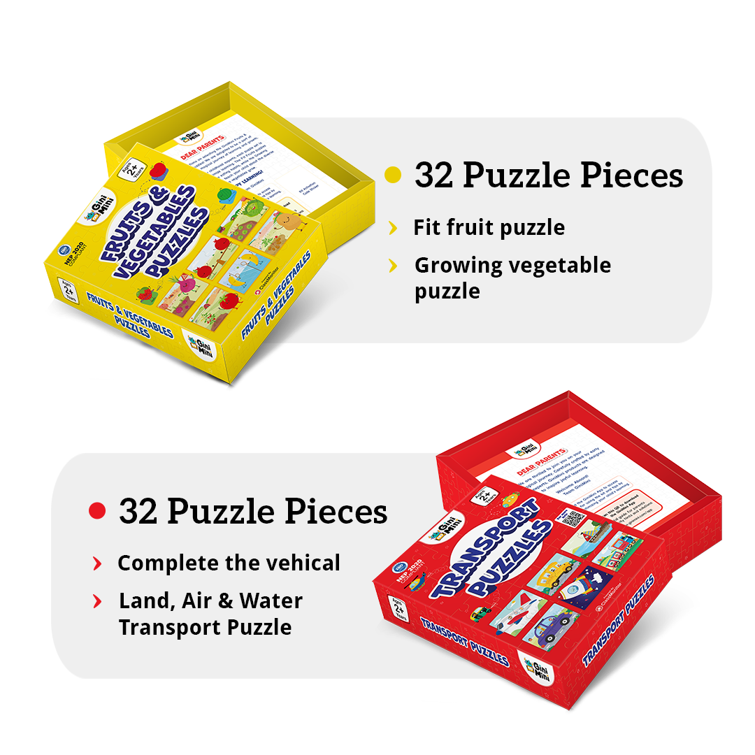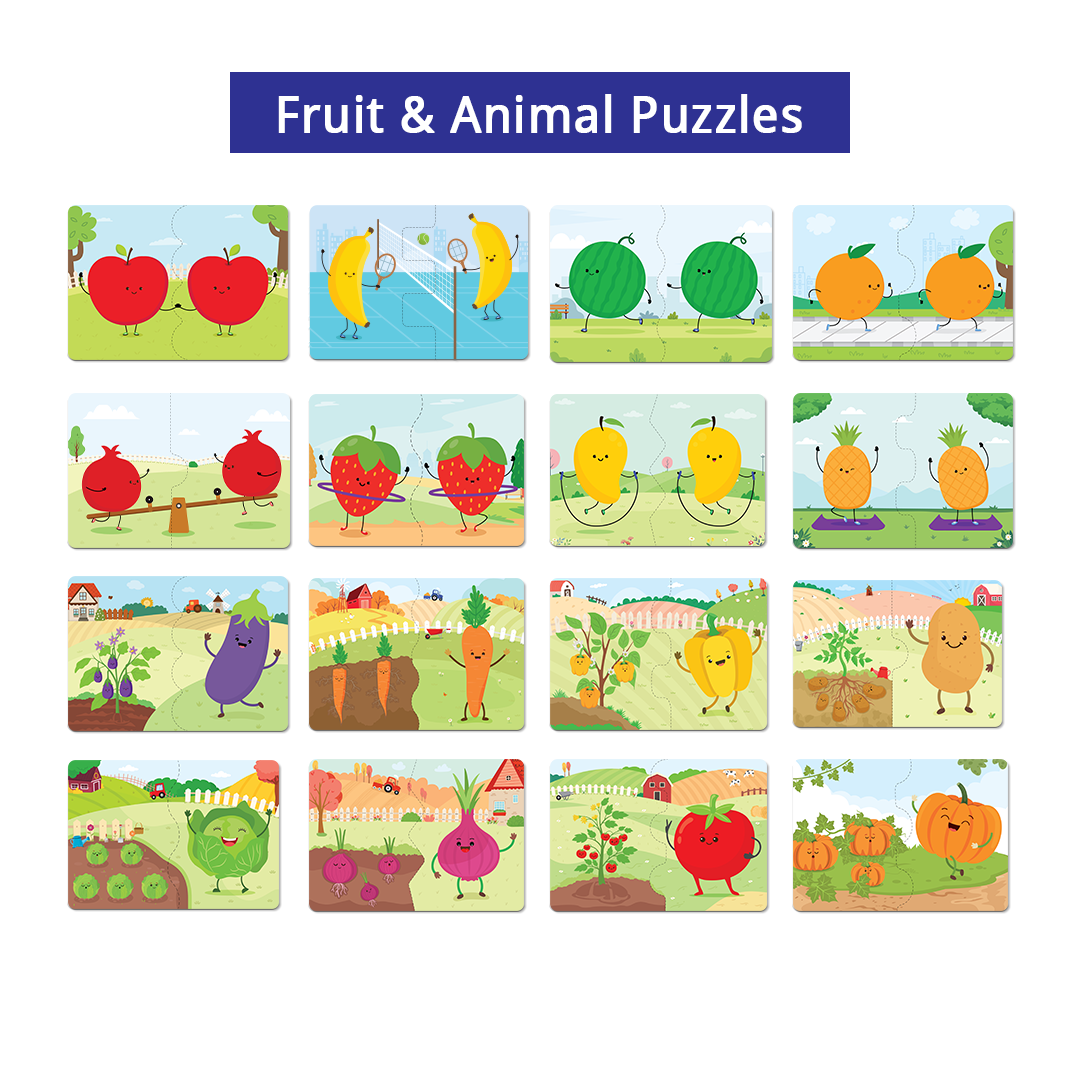 This set of 16 vibrant two-piece puzzles is designed to provide young children with hours of engaging and educational play, promoting optimal skill development. Created by early childhood experts, each puzzle set is carefully crafted to enhance learning experiences. The Fit Fruits puzzles encourage healthy eating habits by introducing various fruits, while the Growing Vegetables puzzles educate your child about the different ways vegetables grow—some underground, others on shrubs, and some as creepers. Give your child this exceptional resource for hands-on, screen-free learning and watch their curiosity and knowledge flourish.