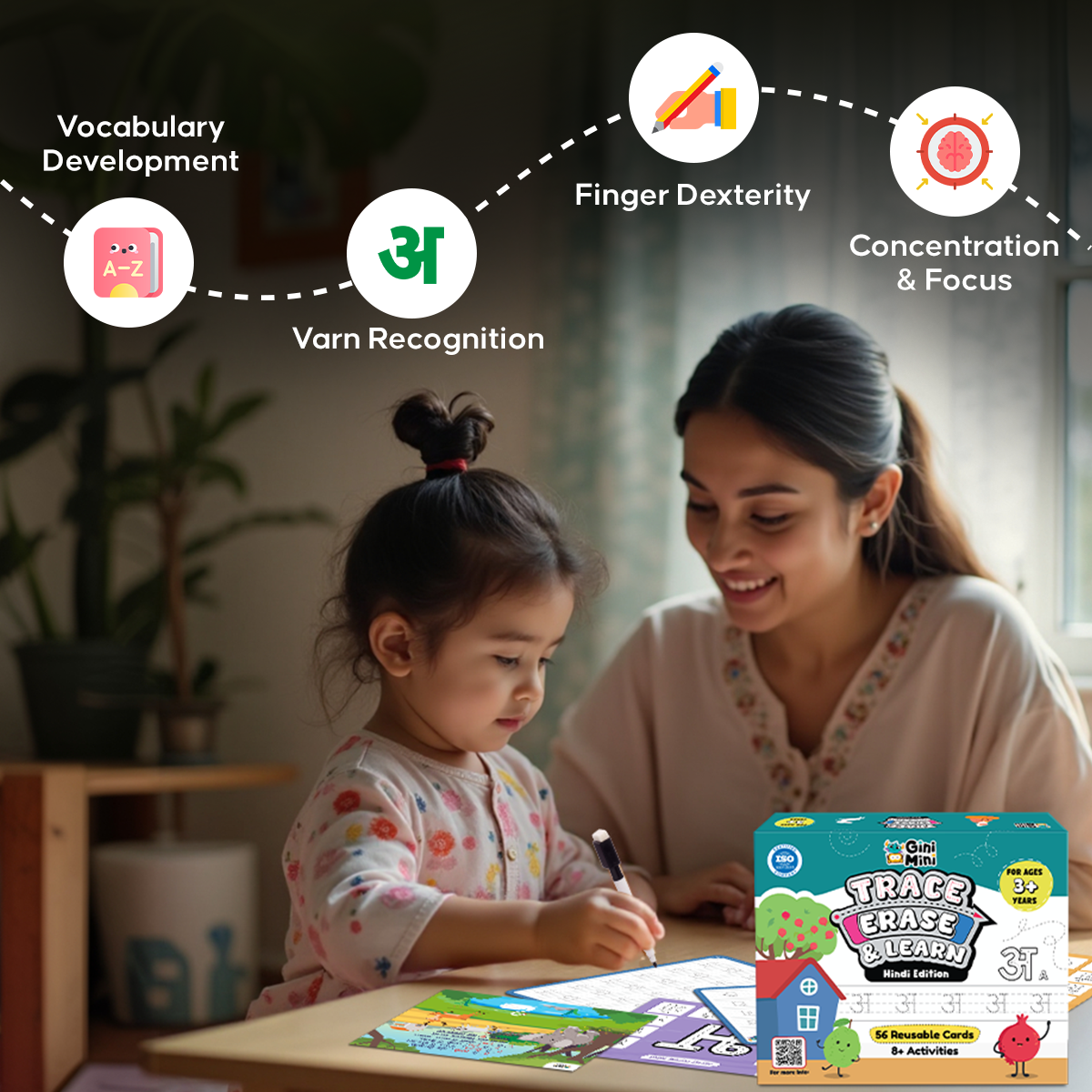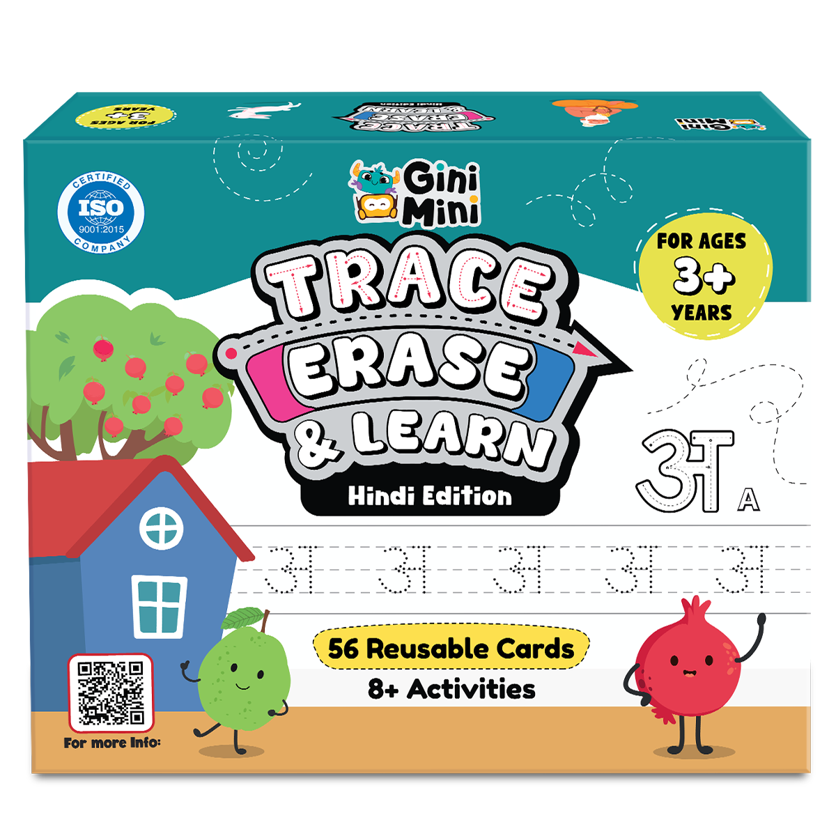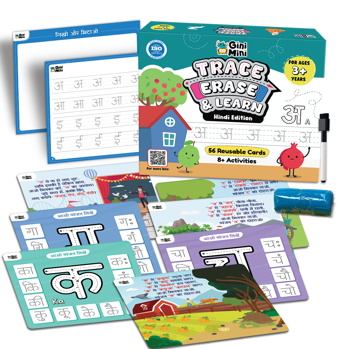 GiniMini’s Trace, Erase & Learn – Hindi Edition is a hands-on pre-writing kit with 56 rewritable cards, a marker, Play-Doh, and rhymes. Perfect for kids aged 3+, it helps them trace Swars & Vyanjans, build fine motor skills, and fall in love with Hindi through play!