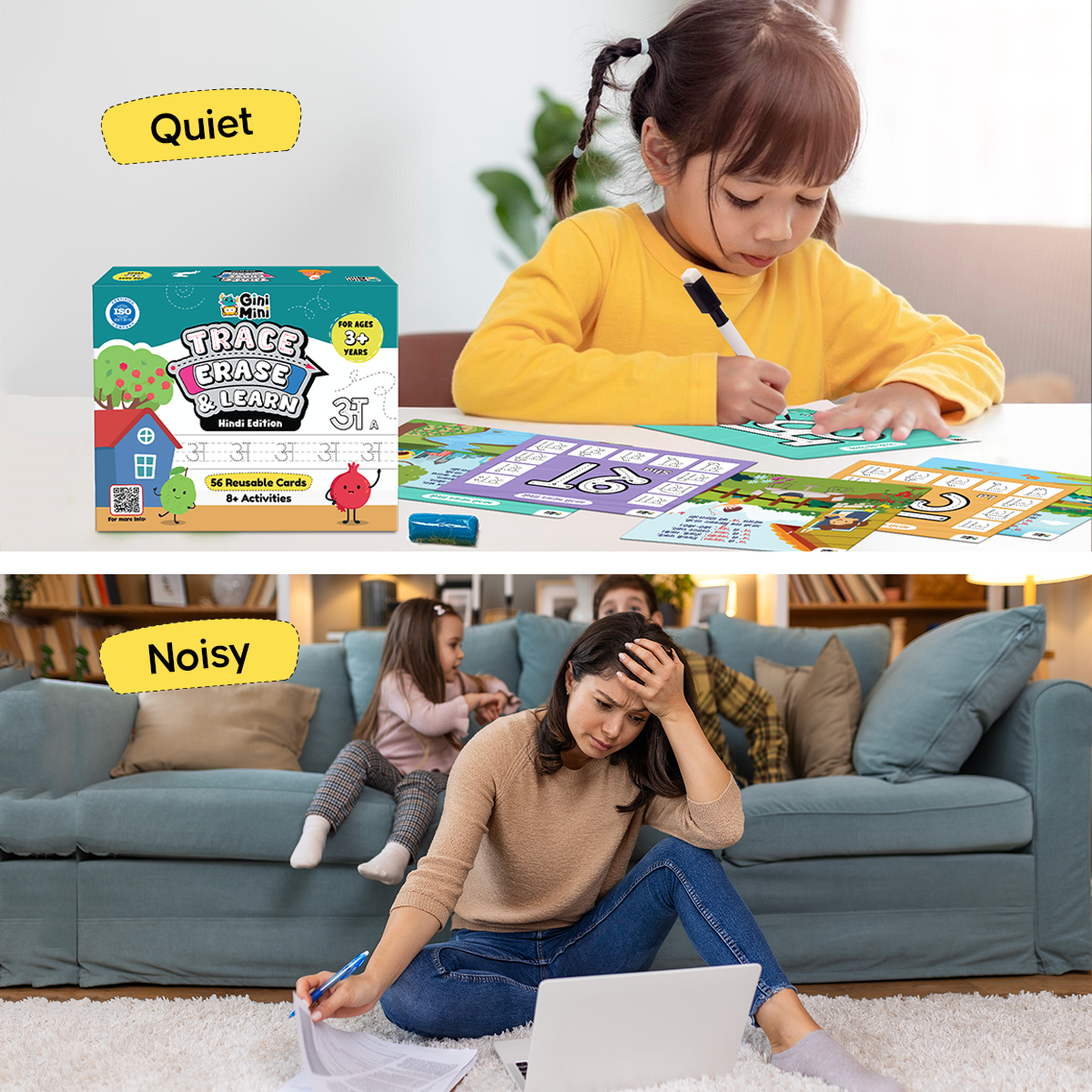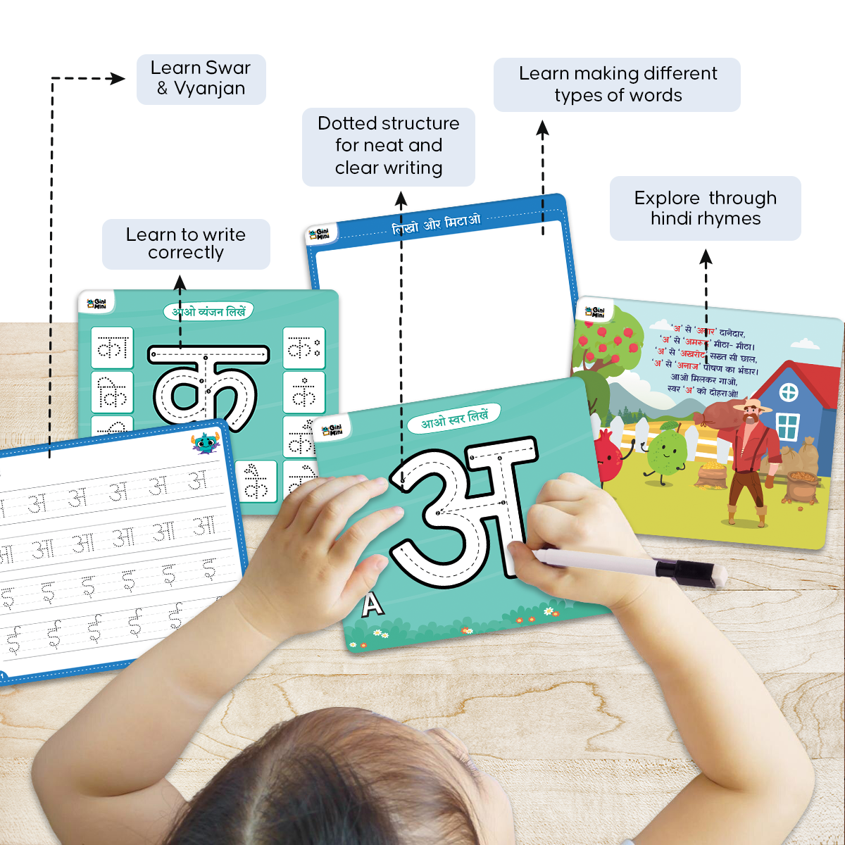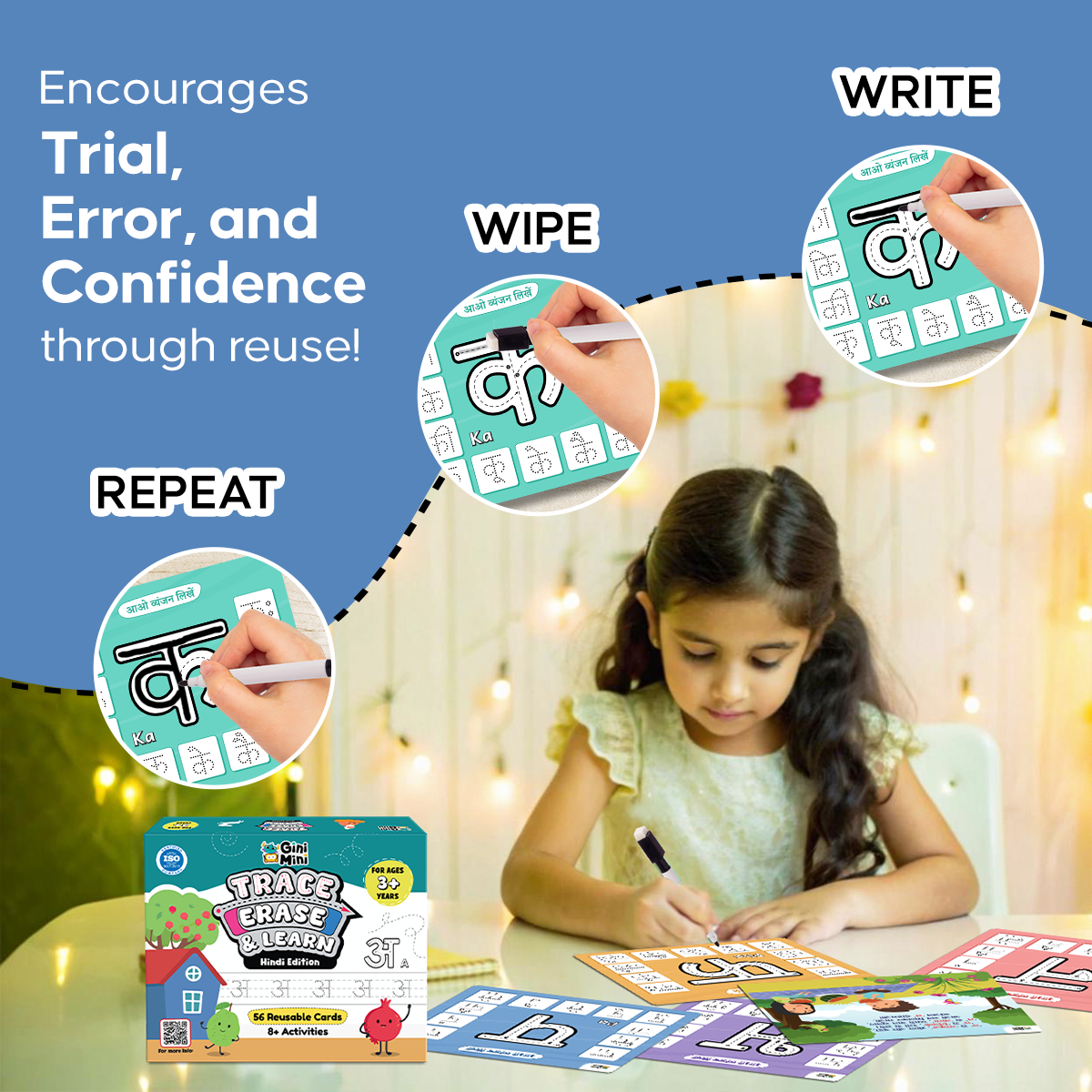 GiniMini’s Trace, Erase & Learn – Hindi Edition is a hands-on pre-writing kit with 56 rewritable cards, a marker, Play-Doh, and rhymes. Perfect for kids aged 3+, it helps them trace Swars & Vyanjans, build fine motor skills, and fall in love with Hindi through play!